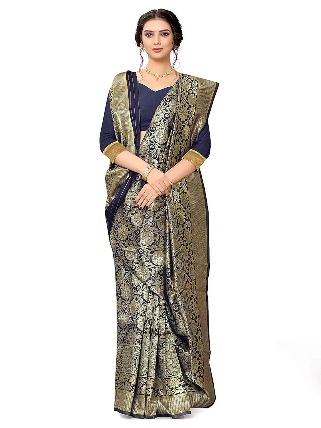 Traditional Indian Banarasi Saree Navy Silk Sari Dress Asian India